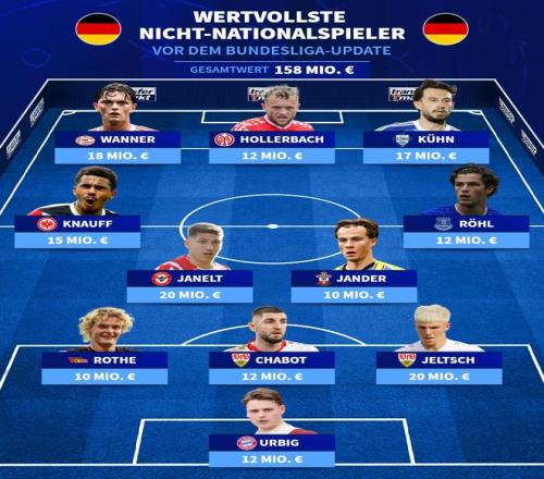 北京时间10月11日,德转统计出了从未入选过德国成年国家队的现役最贵德国11人阵容,布伦特福德中场雅内尔特以及斯图加特后卫耶尔奇以2000万欧元的身价领衔,拜仁慕尼黑的门将乌尔比希以及今夏转会埃因霍温的保罗-万纳在列。