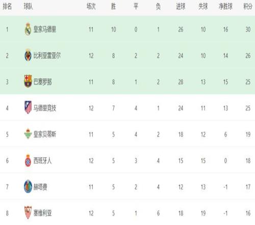 在积分榜上,皇马以30分领跑,10胜1负的战绩极其出色。比利亚雷亚尔这匹大黑马超越了巴萨,升到了第2名。比利亚雷亚尔的战绩是8胜2平2负,拿到26分。而巴萨只拿到25分,排名第3。不过,巴萨比比利亚雷亚尔少踢1场。马竞赢球之后,总积分也达到25分,只是因为净胜球不如巴萨,只能排名第4。皇家贝蒂斯以19分排名第5。第6的是赫塔费,拿到了17分。
